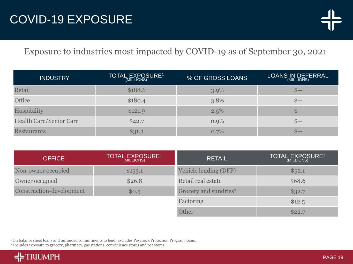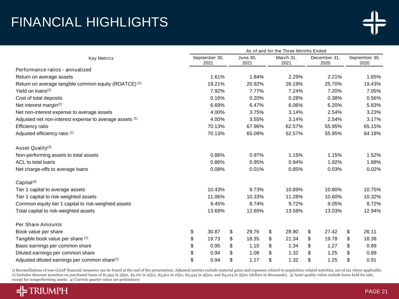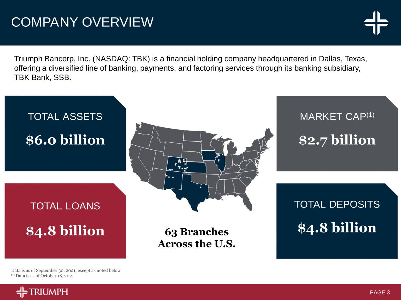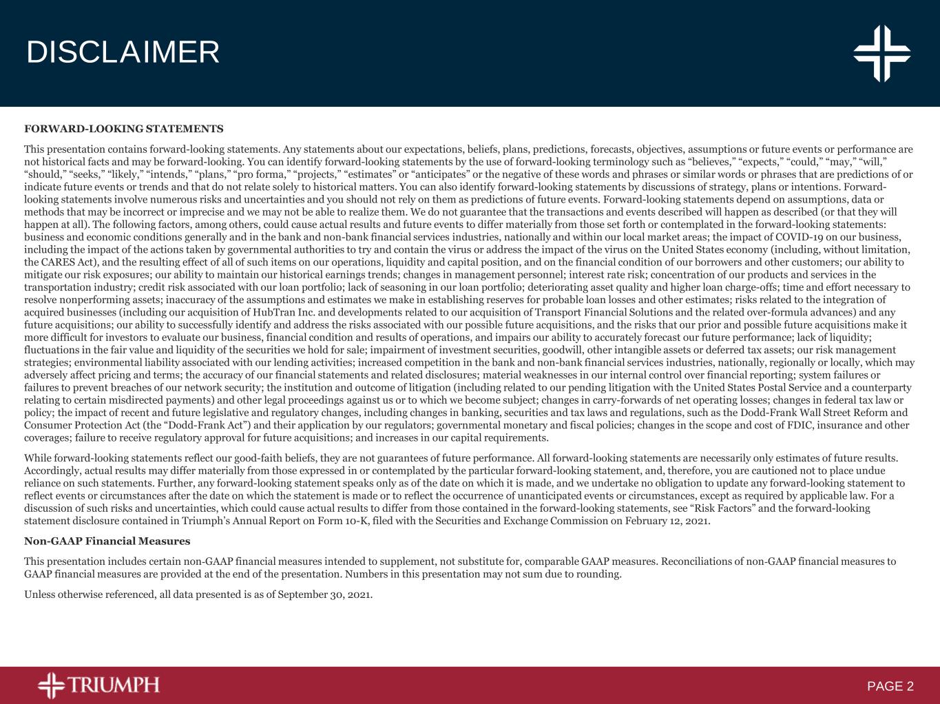 PAGE 2 DISCLAIMER FORWARD-LOOKING STATEMENTS This presentation contains forward-looking statements. Any statements about our expectations, beliefs, plans, predictions, forecasts, objectives, assumptions or future events or performance are not historical facts and may be forward-looking. You can identify forward-looking statements by the use of forward-looking terminology such as “believes,” “expects,” “could,” “may,” “will,” “should,” “seeks,” “likely,” “intends,” “plans,” “pro forma,” “projects,” “estimates” or “anticipates” or the negative of these words and phrases or similar words or phrases that are predictions of or indicate future events or trends and that do not relate solely to historical matters. You can also identify forward-looking statements by discussions of strategy, plans or intentions. Forward- looking statements involve numerous risks and uncertainties and you should not rely on them as predictions of future events. Forward-looking statements depend on assumptions, data or methods that may be incorrect or imprecise and we may not be able to realize them. We do not guarantee that the transactions and events described will happen as described (or that they will happen at all). The following factors, among others, could cause actual results and future events to differ materially from those set forth or contemplated in the forward-looking statements: business and economic conditions generally and in the bank and non-bank financial services industries, nationally and within our local market areas; the impact of COVID-19 on our business, including the impact of the actions taken by governmental authorities to try and contain the virus or address the impact of the virus on the United States economy (including, without limitation, the CARES Act), and the resulting effect of all of such items on our operations, liquidity and capital position, and on the financial condition of our borrowers and other customers; our ability to mitigate our risk exposures; our ability to maintain our historical earnings trends; changes in management personnel; interest rate risk; concentration of our products and services in the transportation industry; credit risk associated with our loan portfolio; lack of seasoning in our loan portfolio; deteriorating asset quality and higher loan charge-offs; time and effort necessary to resolve nonperforming assets; inaccuracy of the assumptions and estimates we make in establishing reserves for probable loan losses and other estimates; risks related to the integration of acquired businesses (including our acquisition of HubTran Inc. and developments related to our acquisition of Transport Financial Solutions and the related over-formula advances) and any future acquisitions; our ability to successfully identify and address the risks associated with our possible future acquisitions, and the risks that our prior and possible future acquisitions make it more difficult for investors to evaluate our business, financial condition and results of operations, and impairs our ability to accurately forecast our future performance; lack of liquidity; fluctuations in the fair value and liquidity of the securities we hold for sale; impairment of investment securities, goodwill, other intangible assets or deferred tax assets; our risk management strategies; environmental liability associated with our lending activities; increased competition in the bank and non-bank financial services industries, nationally, regionally or locally, which may adversely affect pricing and terms; the accuracy of our financial statements and related disclosures; material weaknesses in our internal control over financial reporting; system failures or failures to prevent breaches of our network security; the institution and outcome of litigation (including related to our pending litigation with the United States Postal Service and a counterparty relating to certain misdirected payments) and other legal proceedings against us or to which we become subject; changes in carry-forwards of net operating losses; changes in federal tax law or policy; the impact of recent and future legislative and regulatory changes, including changes in banking, securities and tax laws and regulations, such as the Dodd-Frank Wall Street Reform and Consumer Protection Act (the “Dodd-Frank Act”) and their application by our regulators; governmental monetary and fiscal policies; changes in the scope and cost of FDIC, insurance and other coverages; failure to receive regulatory approval for future acquisitions; and increases in our capital requirements. While forward-looking statements reflect our good-faith beliefs, they are not guarantees of future performance. All forward-looking statements are necessarily only estimates of future results. Accordingly, actual results may differ materially from those expressed in or contemplated by the particular forward-looking statement, and, therefore, you are cautioned not to place undue reliance on such statements. Further, any forward-looking statement speaks only as of the date on which it is made, and we undertake no obligation to update any forward-looking statement to reflect events or circumstances after the date on which the statement is made or to reflect the occurrence of unanticipated events or circumstances, except as required by applicable law. For a discussion of such risks and uncertainties, which could cause actual results to differ from those contained in the forward-looking statements, see “Risk Factors” and the forward-looking statement disclosure contained in Triumph’s Annual Report on Form 10-K, filed with the Securities and Exchange Commission on February 12, 2021. Non-GAAP Financial Measures This presentation includes certain non‐GAAP financial measures intended to supplement, not substitute for, comparable GAAP measures. Reconciliations of non‐GAAP financial measures to GAAP financial measures