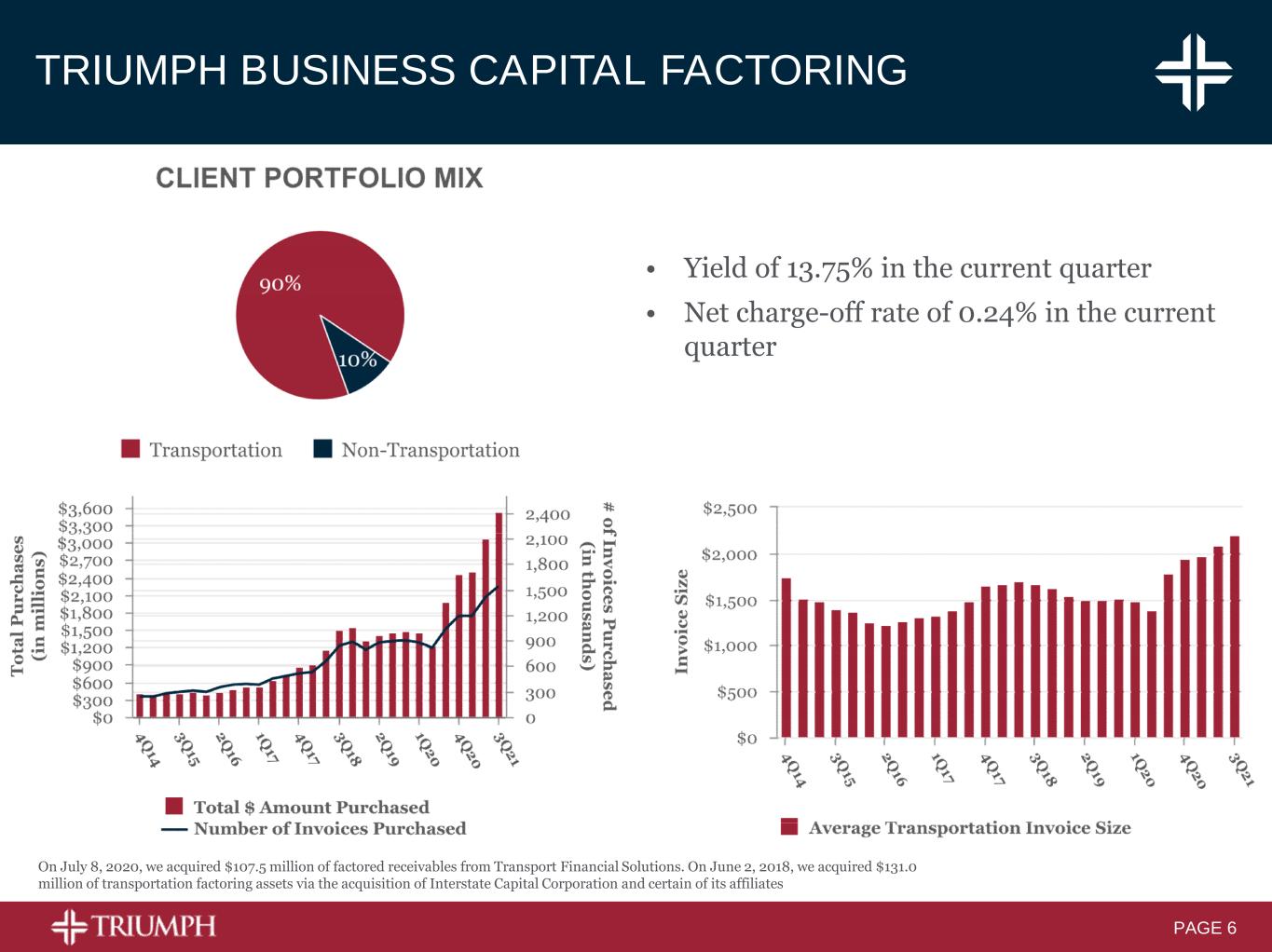 PAGE 6 TRIUMPH BUSINESS CAPITAL FACTORING • Yield of 13.75% in the current quarter • Net charge-off rate of 0.24% in the current quarter On July 8, 2020, we acquired $107.5 million of factored receivables from Transport Financial Solutions. On June 2, 2018, we acquired $131.0 million of transportation factoring assets via the acquisition of Interstate Capital Corporation and certain of its affiliates [Pie Chart] Transportation Non-Transportation 89% 11% [Bar/Line Chart] Total Purchases Number of Invoices Purchased [Bar Chart] Average Invoice Size