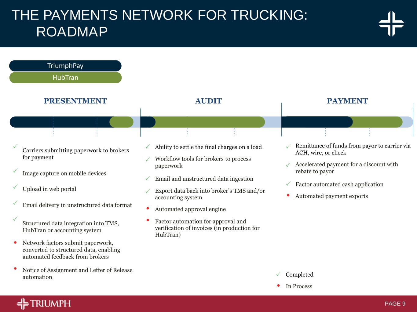PAGE 8 Factor Portal Submit Paperwork Factor Specific Load Data Submit Paperwork Paperwork Status • Receive and Post Payment Approve • Doctype • Carrier • Load Funds drafted once per day Load Data Carrier/Load Mapping Load/Invoice Mapping Payment/Invoice Mapping Carrier/Load Mapping Manual Process Phone Calls Carrier Factor Broker / 3PL HOW BROKERED FREIGHT PAYMENTS OCCUR: THE PAYMENTS NETWORK FOR TRUCKING