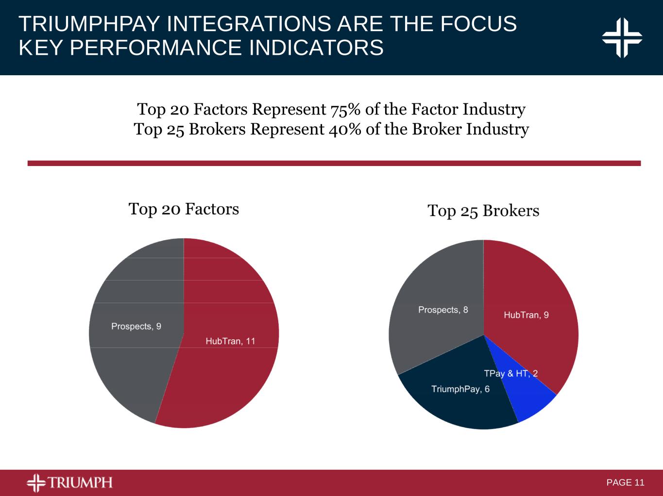 PAGE 11 TRIUMPHPAY INTEGRATIONS ARE THE FOCUS KEY PERFORMANCE INDICATORS Top 20 Factors Represent 75% of the Factor Industry Top 25 Brokers Represent 40% of the Broker Industry