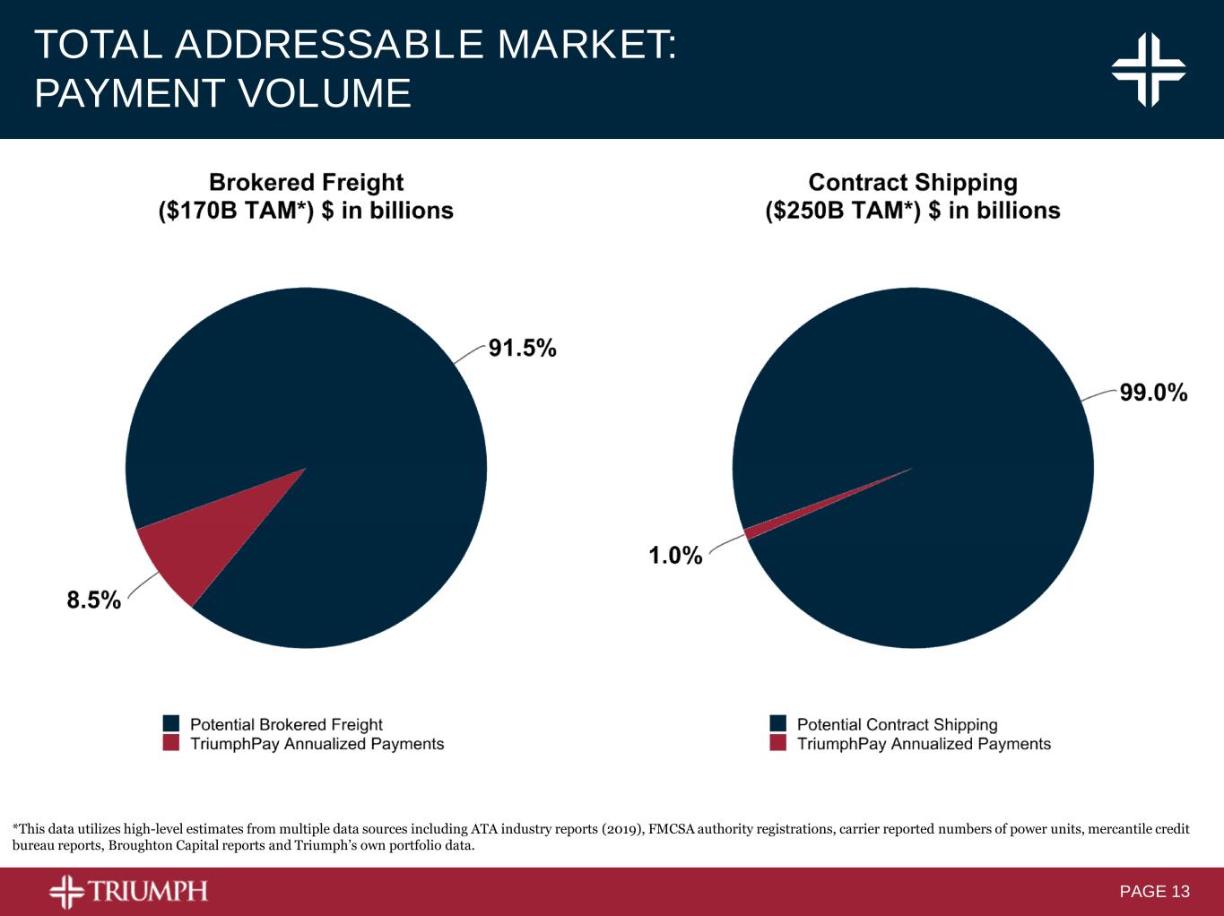 PAGE 12 FOR-HIRE TRUCKING ~$420 Billion* CONTRACT SHIPPING ~$250 Billion* BROKERED FREIGHT ~$170 Billion* *This data utilizes high-level estimates from multiple data sources including ATA industry reports (2019), FMCSA authority registrations, carrier reported numbers of power units, mercantile credit bureau reports, Broughton Capital reports and Triumph’s own portfolio data. TOTAL ADDRESSABLE MARKET In 3Q21, TriumphPay paid an annualized $14.4 billion on behalf of 284 freight broker clients In 3Q21, TriumphPay paid an annualized $2.4 billion on behalf of 38 contract shipping clients