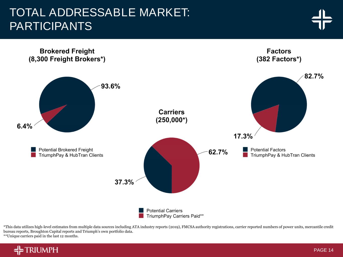 PAGE 13 *This data utilizes high-level estimates from multiple data sources including ATA industry reports (2019), FMCSA authority registrations, carrier reported numbers of power units, mercantile credit bureau reports, Broughton Capital reports and Triumph’s own portfolio data. TOTAL ADDRESSABLE MARKET: PAYMENT VOLUME