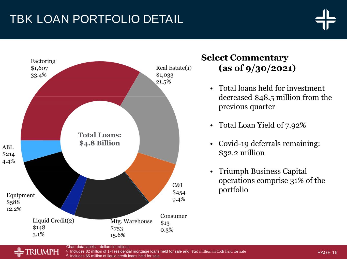 PAGE 16 TBK LOAN PORTFOLIO DETAIL Total Loans: $4.8 Billion Chart data labels – dollars in millions (1) Includes $2 million of 1-4 residential mortgage loans held for sale and $20 million in CRE held for sale (2) Includes $5 million of liquid credit loans held for sale Select Commentary (as of 9/30/2021) • Total loans held for investment decreased $48.5 million from the previous quarter • Total Loan Yield of 7.92% • Covid-19 deferrals remaining: $32.2 million • Triumph Business Capital operations comprise 31% of the portfolio