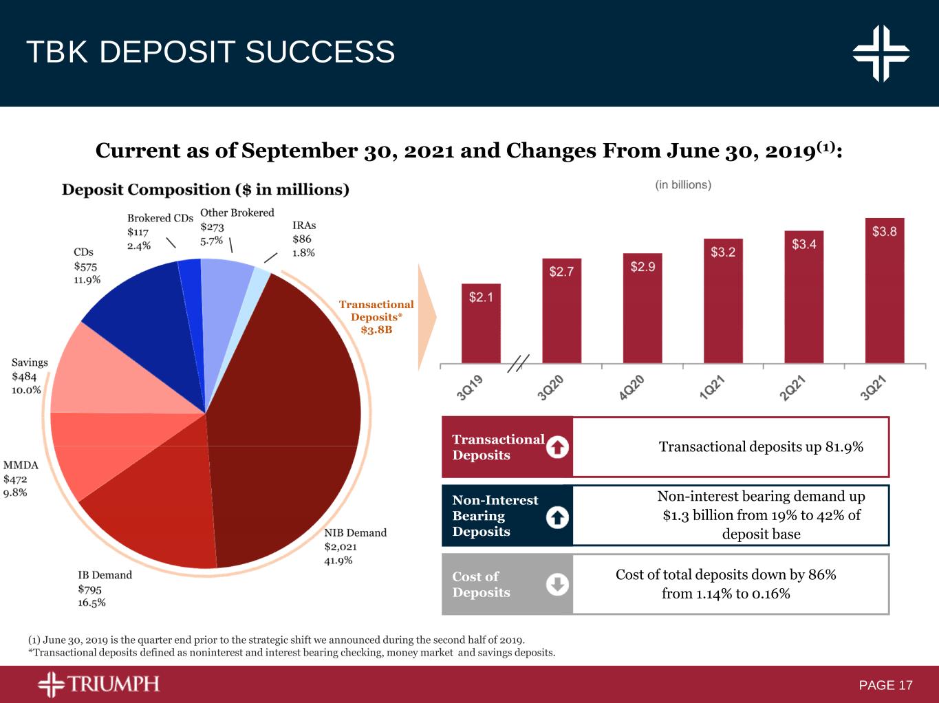 PAGE 17 TBK DEPOSIT SUCCESS (1) June 30, 2019 is the quarter end prior to the strategic shift we announced during the second half of 2019. *Transactional deposits defined as noninterest and interest bearing checking, money market and savings deposits. Non-interest bearing demand Interest bearing demand Individual retirement accounts Money market Savings Certificates of deposit Brokered time deposits Other brokered deposits 29% 14% 2% 8% 9% 17% 11% 10% Cost of interest bearing deposits 0.54% Cost of total funds 0.51% Current as of September 30, 2021 and Changes From June 30, 2019(1): Transactional Deposits* $3.8B Transactional deposits up 81.9% Transactional Deposits Non-Interest Bearing Deposits Non-interest bearing demand up $1.3 billion from 19% to 42% of deposit base Cost of Deposits Cost of total deposits down by 86% from 1.14% to 0.16%