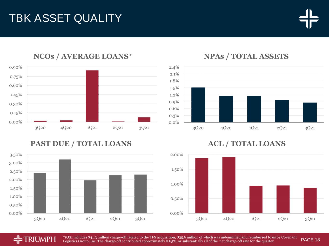 PAGE 18 TBK ASSET QUALITY *1Q21 includes $41.3 million charge-off related to the TFS acquisition, $35.6 million of which was indemnified and reimbursed to us by Covenant Logistics Group, Inc. The charge-off contributed approximately 0.85%, or substantially all of the net charge-off rate for the quarter.