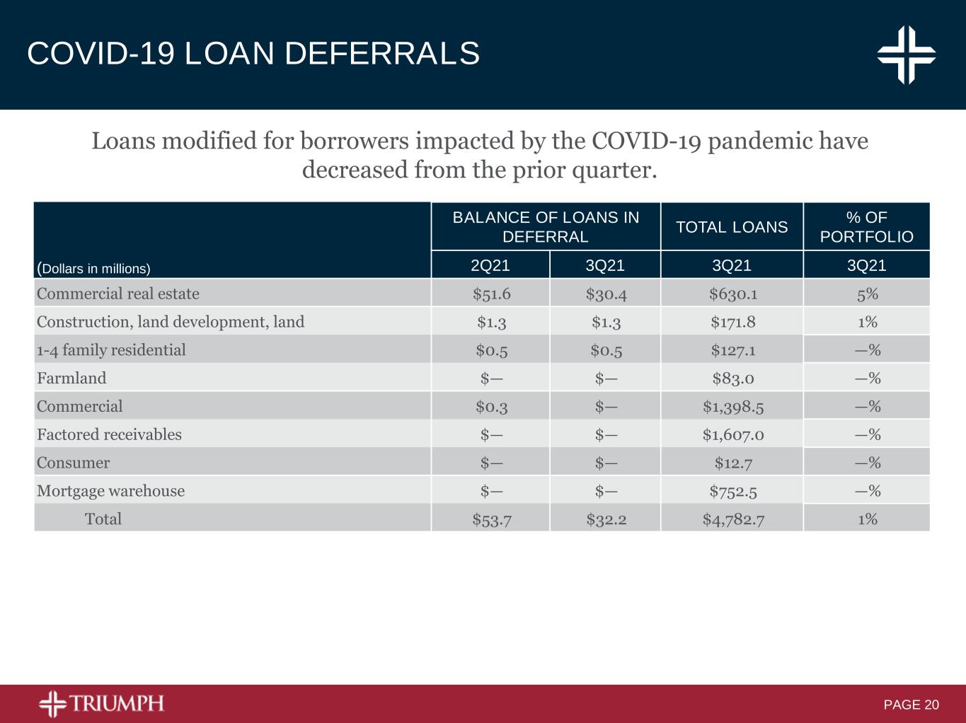PAGE 20 COVID-19 LOAN DEFERRALS (Dollars in millions) BALANCE OF LOANS IN DEFERRAL TOTAL LOANS % OF PORTFOLIO 2Q21 3Q21 3Q21 3Q21 Commercial real estate $51.6 $30.4 $630.1 5% Construction, land development, land $1.3 $1.3 $171.8 1% 1-4 family residential $0.5 $0.5 $127.1 —% Farmland $— $— $83.0 —% Commercial $0.3 $— $1,398.5 —% Factored receivables $— $— $1,607.0 —% Consumer $— $— $12.7 —% Mortgage warehouse $— $— $752.5 —% Total $53.7 $32.2 $4,782.7 1% Loans modified for borrowers impacted by the COVID-19 pandemic have decreased from the prior quarter.