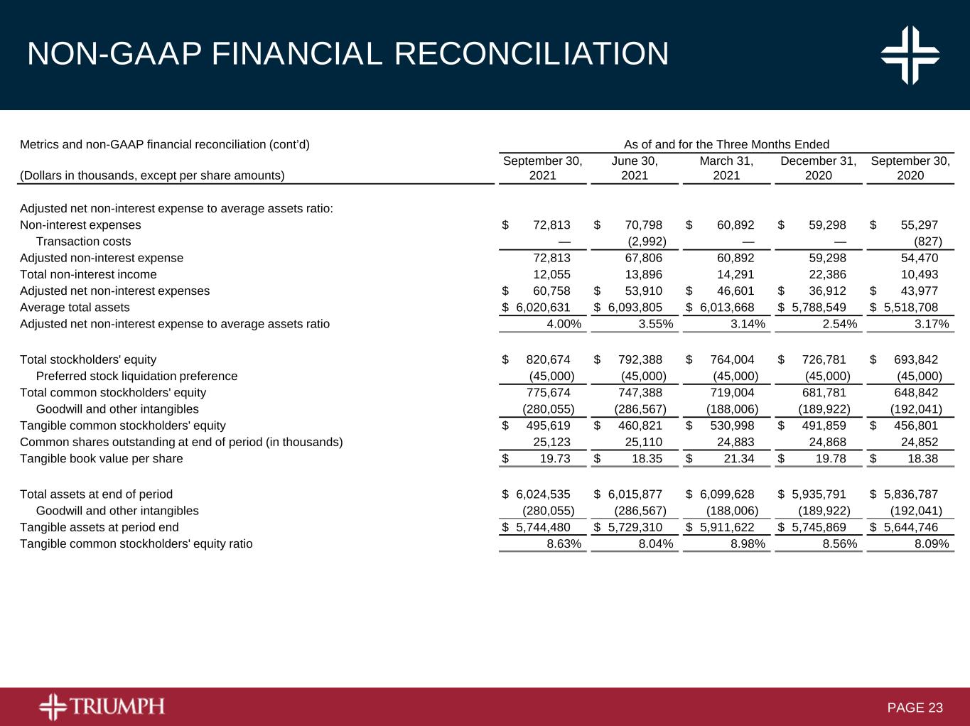 PAGE 23 NON-GAAP FINANCIAL RECONCILIATION Metrics and non-GAAP financial reconciliation (cont'd) As of and for the Three Months Ended December 31, September 30, June 30, March 31, December 31, (Dollars in thousands, except per share amounts) 2020 2020 2020 2020 2019 Adjusted net non-interest expense to average assets ratio: Non-interest expenses $59,298 $55,297 $52,726 $54,753 $52,661 Transaction costs — (827) — — — Adjusted non-interest expense 59,298 54,470 52,726 54,753 52,661 Total non-interest income 22,386 10,493 20,029 7,477 8,666 Gain on sale of subsidiary or division — — (9,758) — — Adjusted non-interest income $22,386 $10,493 $10,271 $7,477 $8,666 Adjusted net non-interest expenses $36,912 $43,977 $42,455 $47,276 $43,995 Average total assets $5,788,549 $5,518,708 $5,487,072 $4,906,547 $5,050,860 Adjusted net non-interest expense to average assets ratio 2.54% 3.17% 3.11% 3.88% 3.46% Total stockholders' equity $726,781 $693,842 $656,871 $589,347 $636,590 Preferred stock liquidation preference (45,000) (45,000) (45,000) — — Total common stockholders' equity 681,781 648,842 611,871 589,347 636,590 Goodwill and other intangibles (189,922) (192,041) (186,162) (188,208) (190,286) Tangible common stockholders' equity $491,859 $456,801 $425,709 $401,139 $446,304 Common shares outstanding at end of period 24,868,218 24,851,601 24,202,686 24,101,120 24,964,961 Tangible book value per share $19.78 $18.38 $17.59 $16.64 $17.88 Total assets at end of period $5,935,791 $5,836,787 $5,617,493 $5,353,729 $5,060,297 Goodwill and other intangibles (189,922) (192,041) (186,162) (188,208) (190,286) Tangible assets at period end $5,745,869 $5,644,746 $5,431,331 $5,165,521 $4,870,011 Tangible common stockholders' equity ratio 8.56% 8.09% 7.84% 7.77% 9.16% Metrics and non-GAAP financial reconciliation (cont’d) As of and for the Three Months Ended (Dollars in thousands, except per share amounts) September 30, 2021 June 30, 2021 March 31, 2021 December 31, 2020 September 30, 2020 Adjusted net non-interest expense to average assets ratio: Non-interest expenses $ 72,813 $ 70,798 $ 60,892 $ 59,298 $ 55,297 Transaction costs — (2,992) — — (827) Adjusted non-interest expense 72,813 67,806 60,892 59,298 54,470 Total non-interest income 12,055 13,896 14,291 22,386 10,493 Adjusted net non-interest expenses $ 60,758 $ 53,910 $ 46,601 $ 36,912 $ 43,977 Average total assets $ 6,020,631 $ 6,093,805 $ 6,013,668 $ 5,788,549 $ 5,518,708 Adjusted net non-interest expense to average assets ratio 4.00% 3.55% 3.14% 2.54% 3.17% Total stockholders' equity $ 820,674 $ 792,388 $ 764,004 $ 726,781 $ 693,842 Preferred stock liquidation preference (45,000) (45,000) (45,000) (45,000) (45,000) Total common stockholders' equity 775,674 747,388 719,004 681,781 648,842 Goodwill and other intangibles (280,055) (286,567) (188,006) (189,922) (192,041) Tangible common stockholders' equity $ 495,619 $ 460,821 $ 530,998 $ 491,859 $ 456,801 Common shares outstanding at end of period (in thousands) 25,123 25,110 24,883 24,868 24,852 Tangible book value per share $ 19.73 $ 18.35 $ 21.34 $ 19.78 $ 18.38 Total assets at end of period $ 6,024,535 $ 6,015,877 $ 6,099,628 $ 5,935,791 $ 5,836,787 Goodwill and other intangibles (280,055) (286,567) (188,006) (189,922) (192,041) Tangible assets at period end $ 5,744,480 $ 5,729,310 $ 5,911,622 $ 5,745,869 $ 5,644,746 Tangible common stockholders' equity ratio 8.63% 8.04% 8.98% 8.56% 8.09%