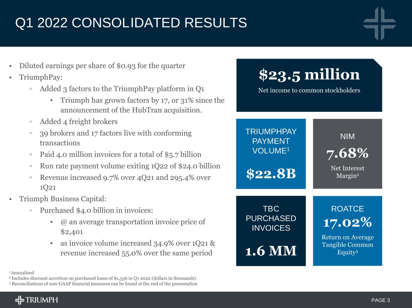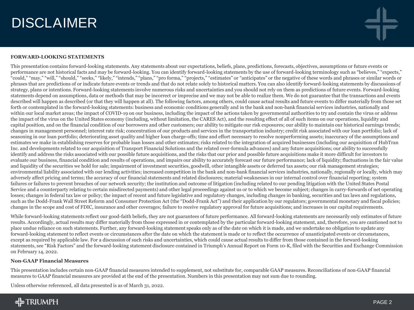 PAGE 2 DISCLAIMER FORWARD-LOOKING STATEMENTS This presentation contains forward-looking statements. Any statements about our expectations, beliefs, plans, predictions, forecasts, objectives, assumptions or future events or performance are not historical facts and may be forward-looking. You can identify forward-looking statements by the use of forward-looking terminology such as “believes,” “expects,” “could,” “may,” “will,” “should,” “seeks,” “likely,” “intends,” “plans,” “pro forma,” “projects,” “estimates” or “anticipates” or the negative of these words and phrases or similar words or phrases that are predictions of or indicate future events or trends and that do not relate solely to historical matters. You can also identify forward-looking statements by discussions of strategy, plans or intentions. Forward-looking statements involve numerous risks and uncertainties and you should not rely on them as predictions of future events. Forward-looking statements depend on assumptions, data or methods that may be incorrect or imprecise and we may not be able to realize them. We do not guarantee that the transactions and events described will happen as described (or that they will happen at all). The following factors, among others, could cause actual results and future events to differ materially from those set forth or contemplated in the forward-looking statements: business and economic conditions generally and in the bank and non-bank financial services industries, nationally and within our local market areas; the impact of COVID-19 on our business, including the impact of the actions taken by governmental authorities to try and contain the virus or address the impact of the virus on the United States economy (including, without limitation, the CARES Act), and the resulting effect of all of such items on our operations, liquidity and capital position, and on the financial condition of our borrowers and other customers; our ability to mitigate our risk exposures; our ability to maintain our historical earnings trends; changes in management personnel; interest rate risk; concentration of our products and services in the transportation industry; credit risk associated with our loan portfolio; lack of seasoning in our loan portfolio; deteriorating asset quality and higher loan charge-offs; time and effort necessary to resolve nonperforming assets; inaccuracy of the assumptions and estimates we make in establishing reserves for probable loan losses and other estimates; risks related to the integration of acquired businesses (including our acquisition of HubTran Inc. and developments related to our acquisition of Transport Financial Solutions and the related over-formula advances) and any future acquisitions; our ability to successfully identify and address the risks associated with our possible future acquisitions, and the risks that our prior and possible future acquisitions make it more difficult for investors to evaluate our business, financial condition and results of operations, and impairs our ability to accurately forecast our future performance; lack of liquidity; fluctuations in the fair value and liquidity of the securities we hold for sale; impairment of investment securities, goodwill, other intangible assets or deferred tax assets; our risk management strategies; environmental liability associated with our lending activities; increased competition in the bank and non-bank financial services industries, nationally, regionally or locally, which may adversely affect pricing and terms; the accuracy of our financial statements and related disclosures; material weaknesses in our internal control over financial reporting; system failures or failures to prevent breaches of our network security; the institution and outcome of litigation (including related to our pending litigation with the United States Postal Service and a counterparty relating to certain misdirected payments) and other legal proceedings against us or to which we become subject; changes in carry-forwards of net operating losses; changes in federal tax law or policy; the impact of recent and future legislative and regulatory changes, including changes in banking, securities and tax laws and regulations, such as the Dodd-Frank Wall Street Reform and Consumer Protection Act (the “Dodd-Frank Act”) and their application by our regulators; governmental monetary and fiscal policies; changes in the scope and cost of FDIC, insurance and other coverages; failure to receive regulatory approval for future acquisitions; and increases in our capital requirements. While forward-looking statements reflect our good-faith beliefs, they are not guarantees of future performance. All forward-looking statements are necessarily only estimates of future results. Accordingly, actual results may differ materially from those expressed in or contemplated by the particular forward-looking statement, and, therefore, you are cautioned not to place undue reliance on such statements. Further, any forward-looking statement speaks only as of the date on which it is made, and we undertake no obligation to update any forward-looking statement to reflect events or circumstances after the date on which the statement is made or to reflect the occurrence of unanticipated events or circumstances, except as required by applicable law. For a discussion of such risks and uncertainties, which could cause actual results to differ from those contained in the forward-looking statements, see “Risk Factors” and the forward-looking statement disclosure contained in Triumph’s Annual Report on Form 10-K, filed with the Securities and Exchange Commission on February 14, 2022. Non-GAAP Financial Measures This presentation includes certain non‐GAAP financial measures intended to supplement, not substitute for, comparable GAAP measures. Reconciliations of non‐GAAP financial measures to GAAP financial measures 
