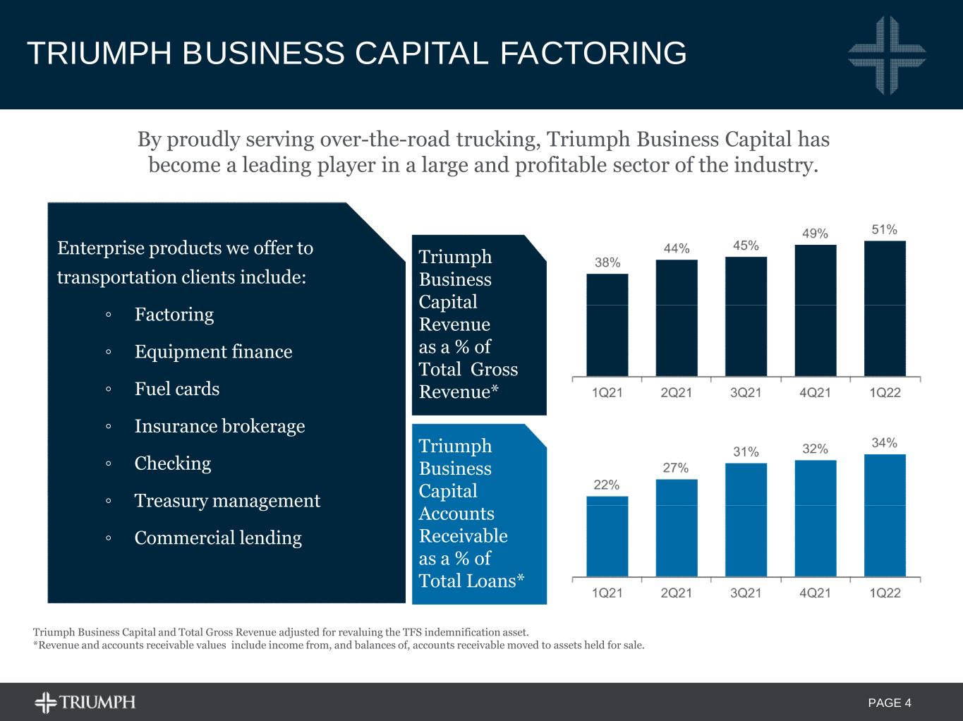 PAGE 3 Q1 2022 CONSOLIDATED RESULTS • Diluted earnings per share of $0.93 for the quarter • TriumphPay: ◦ Added 3 factors to the TriumphPay platform in Q1 ▪ Triumph has grown factors by 17, or 31% since the announcement of the HubTran acquisition. ◦ Added 4 freight brokers ◦ 39 brokers and 17 factors live with conforming transactions ◦ Paid 4.0 million invoices for a total of $5.7 billion ◦ Run rate payment volume exiting 1Q22 of $24.0 billion ◦ Revenue increased 9.7% over 4Q21 and 295.4% over 1Q21 • Triumph Business Capital: ◦ Purchased $4.0 billion in invoices: ▪ @ an average transportation invoice price of $2,401 ▪ as invoice volume increased 34.9% over 1Q21 & revenue increased 55.0% over the same period $23.5 million Net income to common stockholders TRIUMPHPAY PAYMENT VOLUME1 $22.8B NIM 7.68% Net Interest Margin2 ROATCE 17.02% Return on Average Tangible Common Equity3 TBC PURCHASED INVOICES 1.6 MM 1 Annualized 2 Includes discount accretion on purchased loans of $1,536 in Q1 2022 (dollars in thousands) 3 Reconciliations of non-GAAP financial measures can be found at the end of the presentation