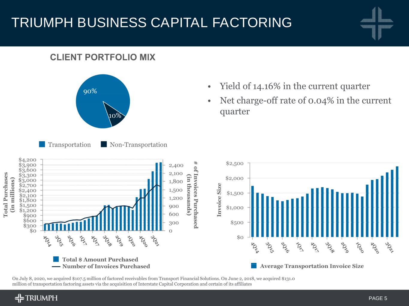 PAGE 4 TRIUMPH BUSINESS CAPITAL FACTORING Triumph Business Capital and Total Gross Revenue adjusted for revaluing the TFS indemnification asset. *Revenue and accounts receivable values include income from, and balances of, accounts receivable moved to assets held for sale. By proudly serving over-the-road trucking, Triumph Business Capital has become a leading player in a large and profitable sector of the industry. Enterprise products we offer to transportation clients include: ◦ Factoring ◦ Equipment finance ◦ Fuel cards ◦ Insurance brokerage ◦ Checking ◦ Treasury management ◦ Commercial lending Triumph Business Capital Revenue as a % of Total Gross Revenue* Triumph Business Capital Accounts Receivable as a % of Total Loans*