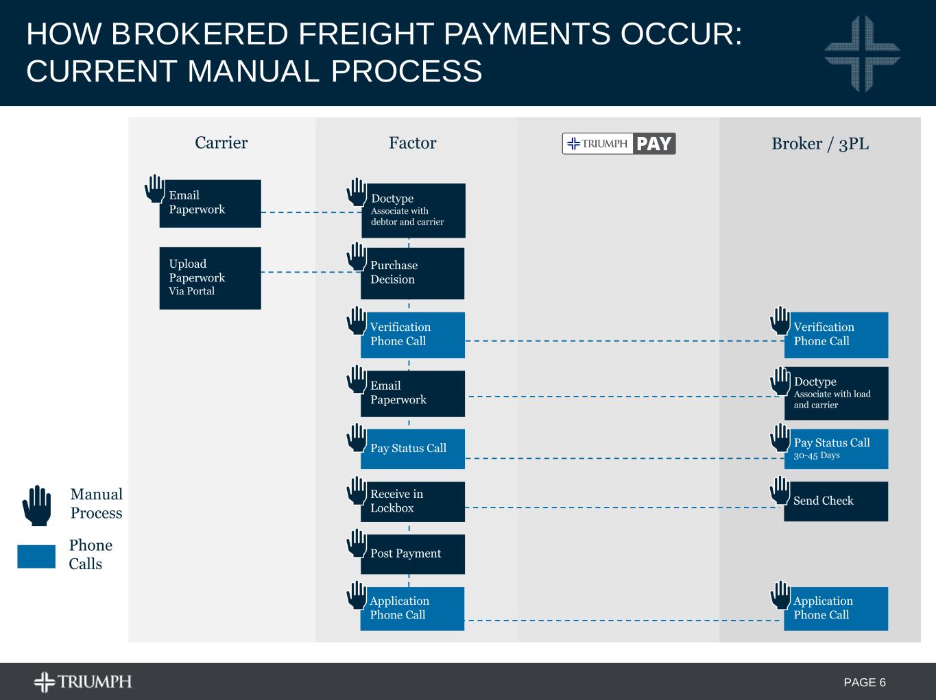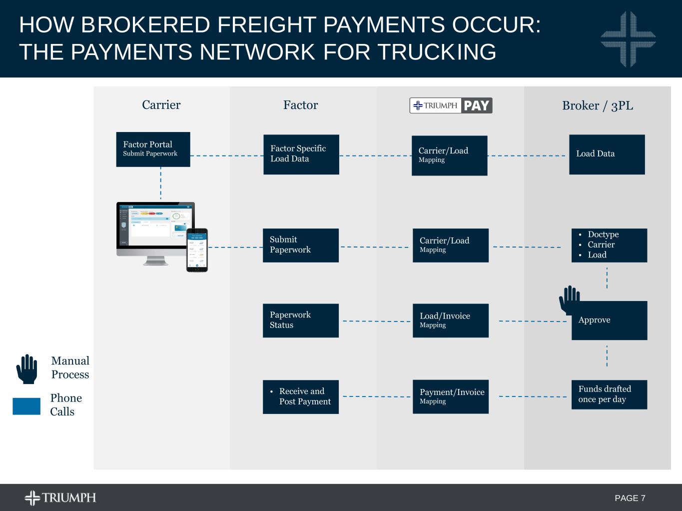 PAGE 6 Manual Process Email Paperwork Upload Paperwork Via Portal Carrier Doctype Associate with load and carrier Send Check Verification Phone Call Pay Status Call 30-45 Days Application Phone Call Phone Calls Doctype Associate with debtor and carrier Verification Phone Call Email Paperwork Pay Status Call Receive in Lockbox Post Payment Application Phone Call Purchase Decision Factor Broker / 3PL HOW BROKERED FREIGHT PAYMENTS OCCUR: CURRENT MANUAL PROCESS