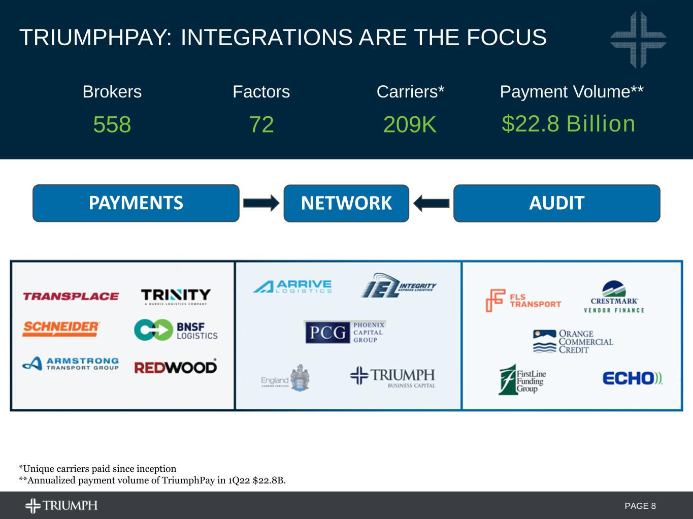 PAGE 7 Factor Portal Submit Paperwork Factor Specific Load Data Submit Paperwork Paperwork Status • Receive and Post Payment Approve • Doctype • Carrier • Load Funds drafted once per day Load Data Carrier/Load Mapping Load/Invoice Mapping Payment/Invoice Mapping Carrier/Load Mapping Manual Process Phone Calls Carrier Factor Broker / 3PL HOW BROKERED FREIGHT PAYMENTS OCCUR: THE PAYMENTS NETWORK FOR TRUCKING