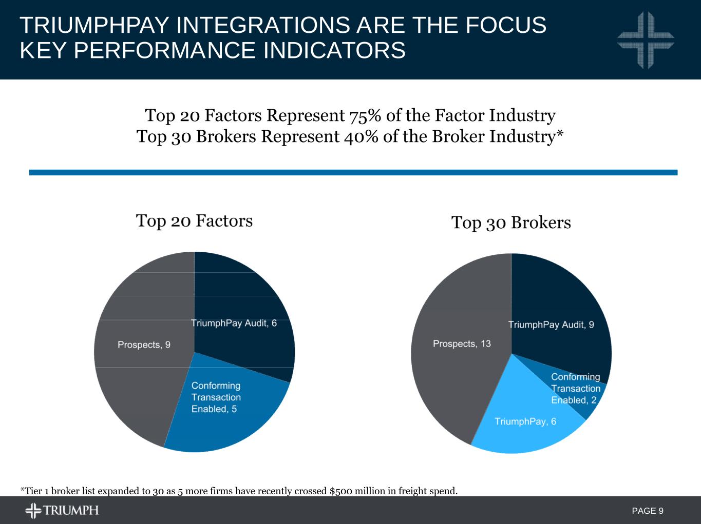 PAGE 9 TRIUMPHPAY INTEGRATIONS ARE THE FOCUS KEY PERFORMANCE INDICATORS Top 20 Factors Represent 75% of the Factor Industry Top 30 Brokers Represent 40% of the Broker Industry* *Tier 1 broker list expanded to 30 as 5 more firms have recently crossed $500 million in freight spend.