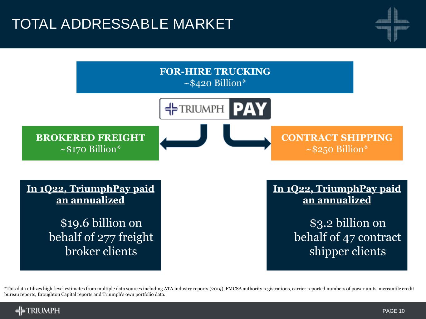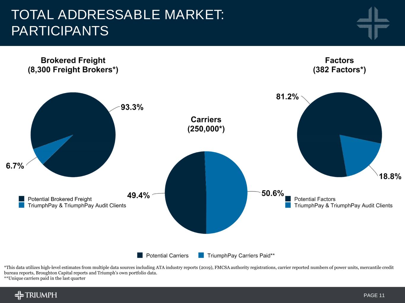 PAGE 10 FOR-HIRE TRUCKING ~$420 Billion* CONTRACT SHIPPING ~$250 Billion* BROKERED FREIGHT ~$170 Billion* *This data utilizes high-level estimates from multiple data sources including ATA industry reports (2019), FMCSA authority registrations, carrier reported numbers of power units, mercantile credit bureau reports, Broughton Capital reports and Triumph’s own portfolio data. TOTAL ADDRESSABLE MARKET In 1Q22, TriumphPay paid an annualized $19.6 billion on behalf of 277 freight broker clients In 1Q22, TriumphPay paid an annualized $3.2 billion on behalf of 47 contract shipper clients