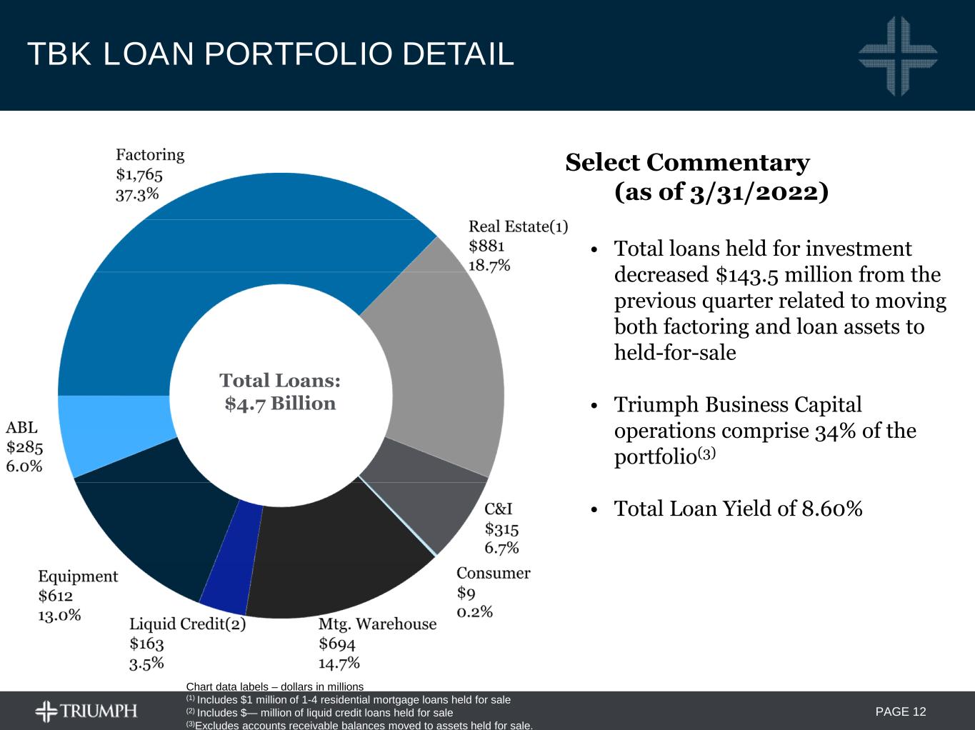 PAGE 12 TBK LOAN PORTFOLIO DETAIL Total Loans: $4.7 Billion Chart data labels – dollars in millions (1) Includes $1 million of 1-4 residential mortgage loans held for sale (2) Includes $— million of liquid credit loans held for sale (3)Excludes accounts receivable balances moved to assets held for sale. Select Commentary (as of 3/31/2022) • Total loans held for investment decreased $143.5 million from the previous quarter related to moving both factoring and loan assets to held-for-sale • Triumph Business Capital operations comprise 34% of the portfolio(3) • Total Loan Yield of 8.60%