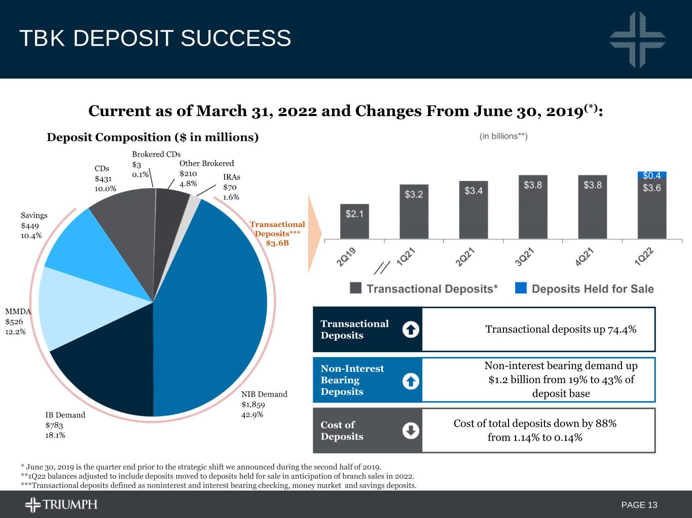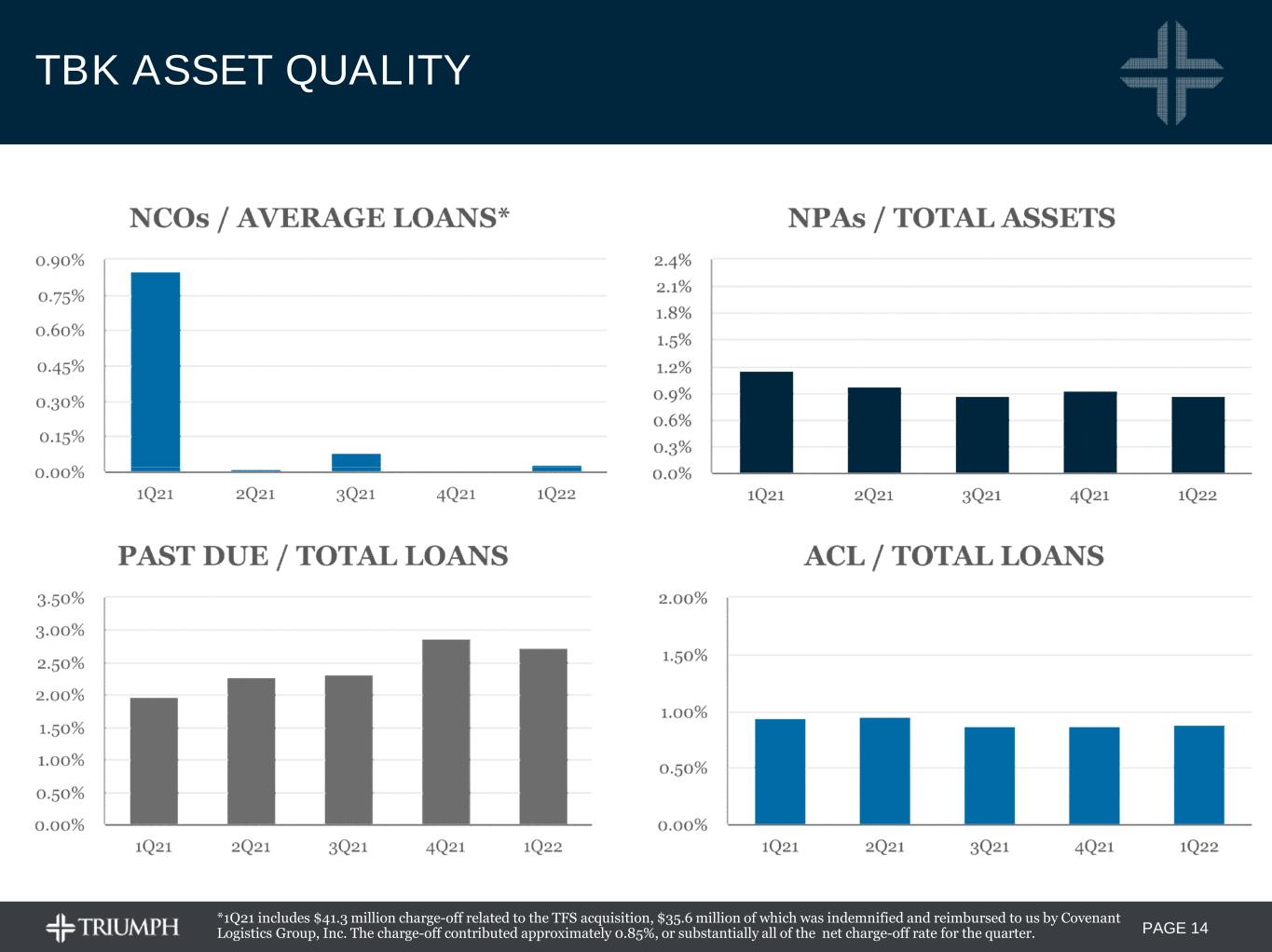 PAGE 13 TBK DEPOSIT SUCCESS * June 30, 2019 is the quarter end prior to the strategic shift we announced during the second half of 2019. **1Q22 balances adjusted to include deposits moved to deposits held for sale in anticipation of branch sales in 2022. ***Transactional deposits defined as noninterest and interest bearing checking, money market and savings deposits. Current as of March 31, 2022 and Changes From June 30, 2019(*): Transactional Deposits*** $3.6B Transactional deposits up 74.4% Transactional Deposits Non-Interest Bearing Deposits Non-interest bearing demand up $1.2 billion from 19% to 43% of deposit base Cost of Deposits Cost of total deposits down by 88% from 1.14% to 0.14%
