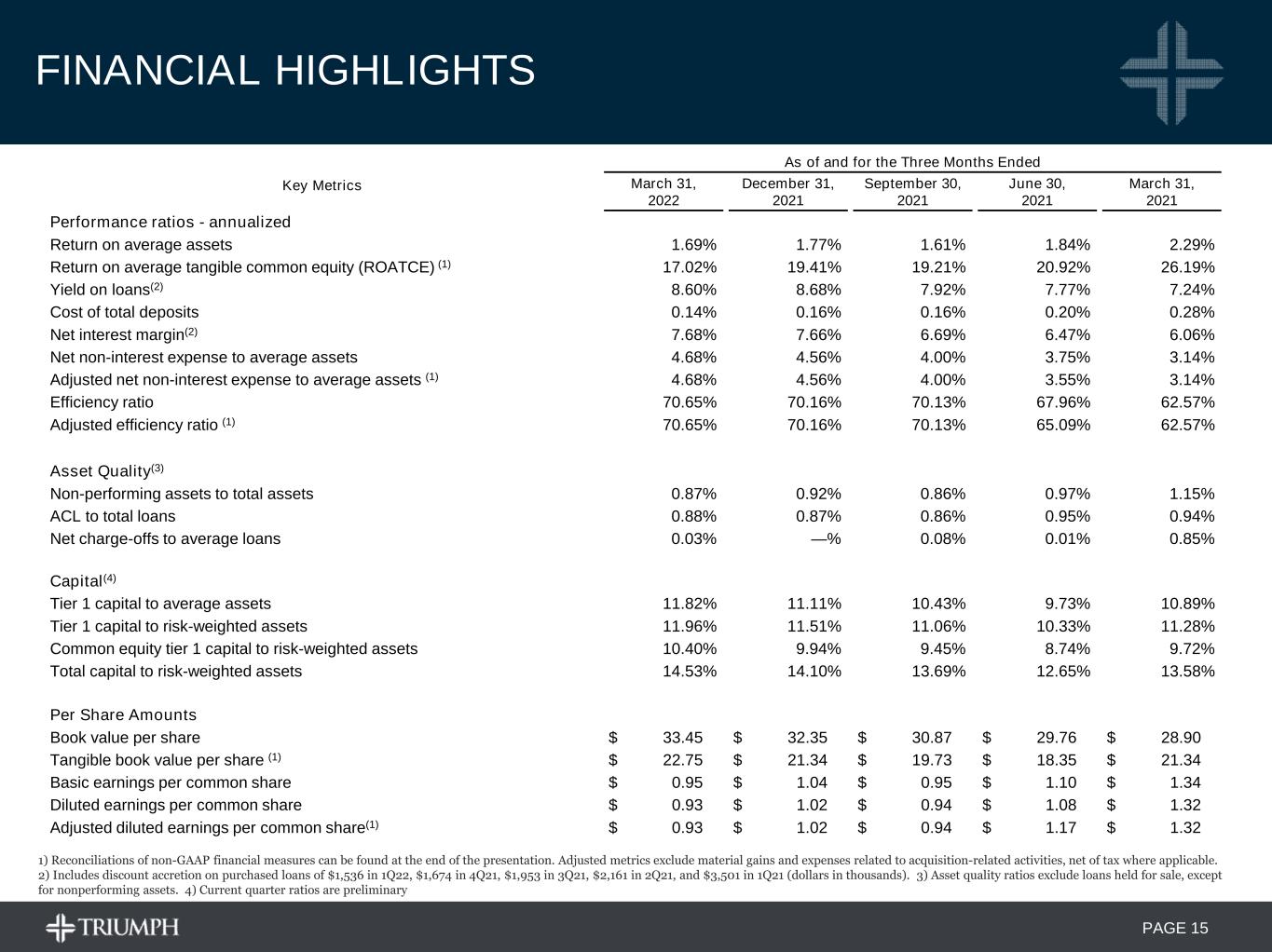 PAGE 15 FINANCIAL HIGHLIGHTS 1) Reconciliations of non-GAAP financial measures can be found at the end of the presentation. Adjusted metrics exclude material gains and expenses related to acquisition-related activities, net of tax where applicable. 2) Includes discount accretion on purchased loans of $1,536 in 1Q22, $1,674 in 4Q21, $1,953 in 3Q21, $2,161 in 2Q21, and $3,501 in 1Q21 (dollars in thousands). 3) Asset quality ratios exclude loans held for sale, except for nonperforming assets. 4) Current quarter ratios are preliminary As of and for the Three Months Ended Key Metrics March 31, 2022 December 31, 2021 September 30, 2021 June 30, 2021 March 31, 2021 Performance ratios - annualized Return on average assets 1.69% 1.77% 1.61% 1.84% 2.29% Return on average tangible common equity (ROATCE) (1) 17.02% 19.41% 19.21% 20.92% 26.19% Yield on loans(2) 8.60% 8.68% 7.92% 7.77% 7.24% Cost of total deposits 0.14% 0.16% 0.16% 0.20% 0.28% Net interest margin(2) 7.68% 7.66% 6.69% 6.47% 6.06% Net non-interest expense to average assets 4.68% 4.56% 4.00% 3.75% 3.14% Adjusted net non-interest expense to average assets (1) 4.68% 4.56% 4.00% 3.55% 3.14% Efficiency ratio 70.65% 70.16% 70.13% 67.96% 62.57% Adjusted efficiency ratio (1) 70.65% 70.16% 70.13% 65.09% 62.57% Asset Quality(3) Non-performing assets to total assets 0.87% 0.92% 0.86% 0.97% 1.15% ACL to total loans 0.88% 0.87% 0.86% 0.95% 0.94% Net charge-offs to average loans 0.03% —% 0.08% 0.01% 0.85% Capital(4) Tier 1 capital to average assets 11.82% 11.11% 10.43% 9.73% 10.89% Tier 1 capital to risk-weighted assets 11.96% 11.51% 11.06% 10.33% 11.28% Common equity tier 1 capital to risk-weighted assets 10.40% 9.94% 9.45% 8.74% 9.72% Total capital to risk-weighted assets 14.53% 14.10% 13.69% 12.65% 13.58% Per Share Amounts Book value per share $ 33.45 $ 32.35 $ 30.87 $ 29.76 $ 28.90 Tangible book value per share (1) $ 22.75 $ 21.34 $ 19.73 $ 18.35 $ 21.34 Basic earnings per common share $ 0.95 $ 1.04 $ 0.95 $ 1.10 $ 1.34 Diluted earnings per common share $ 0.93 $ 1.02 $ 0.94 $ 1.08 $ 1.32 Adjusted diluted earnings per common share(1) $ 0.93 $ 1.02 $ 0.94 $ 1.17 $ 1.32