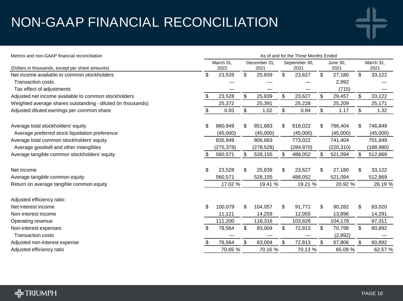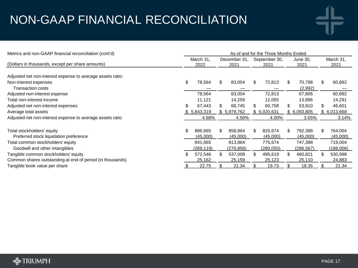 PAGE 16 NON-GAAP FINANCIAL RECONCILIATION Metrics and non-GAAP financial reconciliation As of and for the Three Months Ended December 31, September 30, June 30, March 31, December 31, (Dollars in thousands, except per share amounts) 2020 2020 2020 2020 2019 Net income available to common stockholders $31,328 $22,005 $13,440 $(4,450) $16,709 Transaction costs — 827 — — — Gain on sale of subsidiary or division — — (9,758) — — Tax effect of adjustments — (197) 2,451 — — Adjusted net income available to common stockholders $31,328 $22,635 $6,133 $(4,450) $16,709 Weighted average shares outstanding - diluted 25,053,386 24,802,388 24,074,442 24,314,329 25,254,862 Adjusted diluted earnings per common share $1.25 $0.91 $0.25 $(0.18) $0.66 Average total stockholders' equity $720,892 $688,327 $610,258 $627,369 $647,546 Average preferred stock liquidation preference (45,000) (45,000) (5,934) — — Average total common stockholders' equity 675,892 643,327 604,324 627,369 647,546 Average goodwill and other intangibles (191,017) (192,682) (187,255) (189,359) (191,551) Average tangible common stockholders' equity $484,875 $450,645 $417,069 $438,010 $455,995 Net income (loss) $31,328 $22,005 $13,440 $(4,450) $16,709 Average tangible common equity 484,875 450,645 417,069 438,010 455,995 Return on average tangible common equity 25.70% 19.43% 12.96% (4.09%) 14.54% Adjusted efficiency ratio: Net interest income $83,598 $74,379 $64,251 $62,500 $66,408 Non-interest income 22,386 10,493 20,029 7,477 8,666 Operating revenue 105,984 84,872 84,280 69,977 75,074 Gain on sale of subsidiary or division — — (9,758) — — Adjusted operating revenue $105,984 $84,872 $74,522 $69,977 $75,074 Non-interest expenses $59,298 $55,297 $52,726 $54,753 $52,661 Transaction costs — (827) — — — Adjusted non-interest expense $59,298 $54,470 $52,726 $54,753 $52,661 Adjusted efficiency ratio 55.95% 64.18% 70.75% 78.24% 70.15% Metrics and non-GAAP financial reconciliation As of and for the Three Months Ended (Dollars in thousands, except per share amounts) March 31, 2022 December 31, 2021 September 30, 2021 June 30, 2021 March 31, 2021 Net income available to common stockholders $ 23,528 $ 25,839 $ 23,627 $ 27,180 $ 33,122 Transaction costs — — — 2,992 — Tax effect of adjustments — — — (715) — Adjusted net income available to common stockholders $ 23,528 $ 25,839 $ 23,627 $ 29,457 $ 33,122 Weighted average shares outstanding - diluted (in thousands) 25,372 25,391 25,228 25,209 25,171 Adjusted diluted earnings per common share $ 0.93 $ 1.02 $ 0.94 $ 1.17 $ 1.32 Average total stockholders' equity $ 880,949 $ 851,683 $ 818,022 $ 786,404 $ 746,849 Average preferred stock liquidation preference (45,000) (45,000) (45,000) (45,000) (45,000) Average total common stockholders' equity 835,949 806,683 773,022 741,404 701,849 Average goodwill and other intangibles (275,378) (278,528) (284,970) (220,310) (188,980) Average tangible common stockholders' equity $ 560,571 $ 528,155 $ 488,052 $ 521,094 $ 512,869 Net income $ 23,528 $ 25,839 $ 23,627 $ 27,180 $ 33,122 Average tangible common equity 560,571 528,155 488,052 521,094 512,869 Return on average tangible common equity 17.02 % 19.41 % 19.21 % 20.92 % 26.19 % Adjusted efficiency ratio: Net interest income $ 100,079 $ 104,057 $ 91,771 $ 90,282 $ 83,020 Non-interest income 11,121 14,259 12,055 13,896 14,291 Operating revenue 111,200 118,316 103,826 104,178 97,311 Non-interest expenses $ 78,564 $ 83,004 $ 72,813 $ 70,798 $ 60,892 Transaction costs — — — (2,992) — Adjusted non-interest expense $ 78,564 $ 83,004 $ 72,813 $ 67,806 $ 60,892 Adjusted efficiency ratio 70.65 % 70.16 % 70.13 % 65.09 % 62.57 %