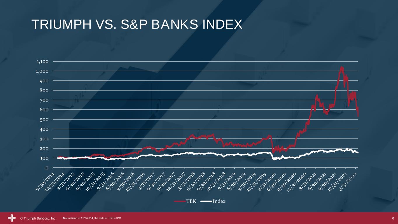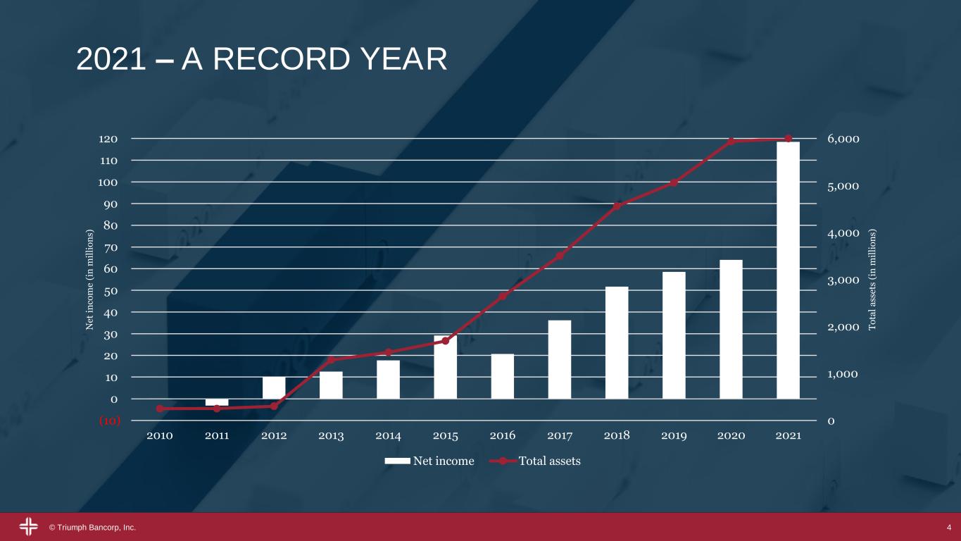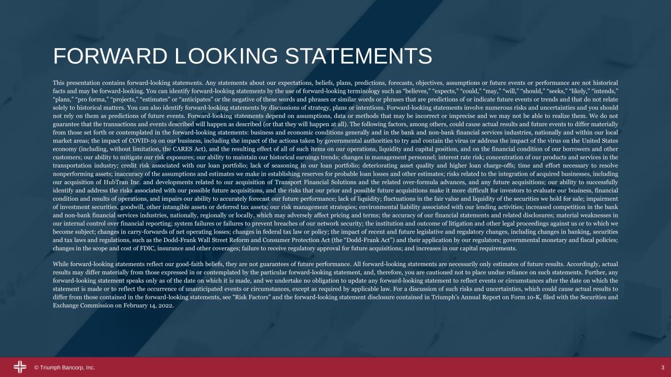 © Triumph Bancorp, Inc. FORWARD LOOKING STATEMENTS This presentation contains forward-looking statements. Any statements about our expectations, beliefs, plans, predictions, forecasts, objectives, assumptions or future events or performance are not historical facts and may be forward-looking. You can identify forward-looking statements by the use of forward-looking terminology such as “believes,” “expects,” “could,” “may,” “will,” “should,” “seeks,” “likely,” “intends,” “plans,” “pro forma,” “projects,” “estimates” or “anticipates” or the negative of these words and phrases or similar words or phrases that are predictions of or indicate future events or trends and that do not relate solely to historical matters. You can also identify forward-looking statements by discussions of strategy, plans or intentions. Forward-looking statements involve numerous risks and uncertainties and you should not rely on them as predictions of future events. Forward-looking statements depend on assumptions, data or methods that may be incorrect or imprecise and we may not be able to realize them. We do not guarantee that the transactions and events described will happen as described (or that they will happen at all). The following factors, among others, could cause actual results and future events to differ materially from those set forth or contemplated in the forward-looking statements: business and economic conditions generally and in the bank and non-bank financial services industries, nationally and within our local market areas; the impact of COVID-19 on our business, including the impact of the actions taken by governmental authorities to try and contain the virus or address the impact of the virus on the United States economy (including, without limitation, the CARES Act), and the resulting effect of all of such items on our operations, liquidity and capital position, and on the financial condition of our borrowers and other customers; our ability to mitigate our risk exposures; our ability to maintain our historical earnings trends; changes in management personnel; interest rate risk; concentration of our products and services in the transportation industry; credit risk associated with our loan portfolio; lack of seasoning in our loan portfolio; deteriorating asset quality and higher loan charge-offs; time and effort necessary to resolve nonperforming assets; inaccuracy of the assumptions and estimates we make in establishing reserves for probable loan losses and other estimates; risks related to the integration of acquired businesses, including our acquisition of HubTran Inc. and developments related to our acquisition of Transport Financial Solutions and the related over-formula advances, and any future acquisitions; our ability to successfully identify and address the risks associated with our possible future acquisitions, and the risks that our prior and possible future acquisitions make it more difficult for investors to evaluate our business, financial condition and results of operations, and impairs our ability to accurately forecast our future performance; lack of liquidity; fluctuations in the fair value and liquidity of the securities we hold for sale; impairment of investment securities, goodwill, other intangible assets or deferred tax assets; our risk management strategies; environmental liability associated with our lending activities; increased competition in the bank and non-bank financial services industries, nationally, regionally or locally, which may adversely affect pricing and terms; the accuracy of our financial statements and related disclosures; material weaknesses in our internal control over financial reporting; system failures or failures to prevent breaches of our network security; the institution and outcome of litigation and other legal proceedings against us or to which we become subject; changes in carry-forwards of net operating losses; changes in federal tax law or policy; the impact of recent and future legislative and regulatory changes, including changes in banking, securities and tax laws and regulations, such as the Dodd-Frank Wall Street Reform and Consumer Protection Act (the “Dodd-Frank Act”) and their application by our regulators; governmental monetary and fiscal policies; changes in the scope and cost of FDIC, insurance and other coverages; failure to receive regulatory approval for future acquisitions; and increases in our capital requirements. While forward-looking statements reflect our good-faith beliefs, they are not guarantees of future performance. All forward-looking statements are necessarily only estimates of future results. Accordingly, actual results may differ materially from those expressed in or contemplated by the particular forward-looking statement, and, therefore, you are cautioned not to place undue reliance on such statements. Further, any forward-looking statement speaks only as of the date on which it is made, and we undertake no obligation to update any forward-looking statement to reflect events or circumstances after the date on which the statement is made or to reflect the occurrence of unanticipated events or circumstances, except as required by applicable law. For a discussion of such risks and uncertainties, which could cause actual results to differ from those contained in the forward-looking statements, see "Risk Factors" and the forward-looking statement disclosure contained in Triumph’s Annual Report on Form 10-K, filed with the Securities and Exchange Commission on February 14, 2022. 3