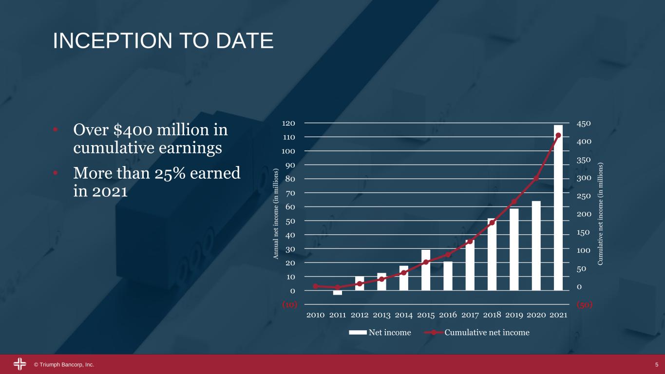 © Triumph Bancorp, Inc. 0 1,000 2,000 3,000 4,000 5,000 6,000 (10) 0 10 20 30 40 50 60 70 80 90 100 110 120 2010 2011 2012 2013 2014 2015 2016 2017 2018 2019 2020 2021 T o ta l a ss et s (i n m il li o n s) N et i n co m e (i n m il li o n s) Net income Total assets 2021 – A RECORD YEAR 4