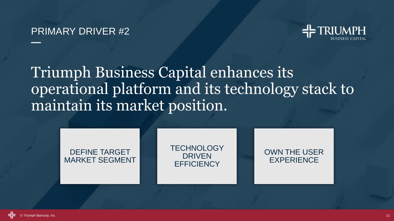 © Triumph Bancorp, Inc. PRIMARY DRIVER #1 — TriumphPay establishes THE payments network for trucking, demonstrating scalable and defensible revenue growth. 10 HIRE THE BEST TALENT LAND AND EXPAND ACQUIRE SHIPPER MARKET SHARE DEFEND THE FORTRESS