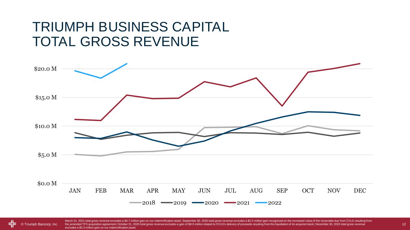 © Triumph Bancorp, Inc. TRIUMPH BUSINESS CAPITAL TOTAL GROSS REVENUE 12 $0.0 M $5.0 M $10.0 M $15.0 M $20.0 M JAN FEB MAR APR MAY JUN JUL AUG SEP OCT NOV DEC 2018 2019 2020 2021 2022 March 31, 2021 total gross revenue excludes a $4.7 million gain on our indemnification asset; September 30, 2020 total gross revenue excludes a $2.0 million gain recognized on the increased value of the receivable due from CVLG resulting from the amended TFS acquisition agreement; October 31, 2020 total gross revenue excludes a gain of $8.9 million related to CVLG’s delivery of proceeds resulting from the liquidation of its acquired stock; December 30, 2020 total gross revenue excludes a $5.3 million gain on our indemnification asset.