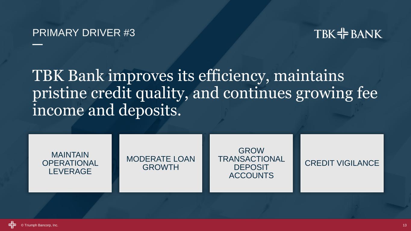 © Triumph Bancorp, Inc. PRIMARY DRIVER #2 — Triumph Business Capital enhances its operational platform and its technology stack to maintain its market position. 11 DEFINE TARGET MARKET SEGMENT TECHNOLOGY DRIVEN EFFICIENCY OWN THE USER EXPERIENCE