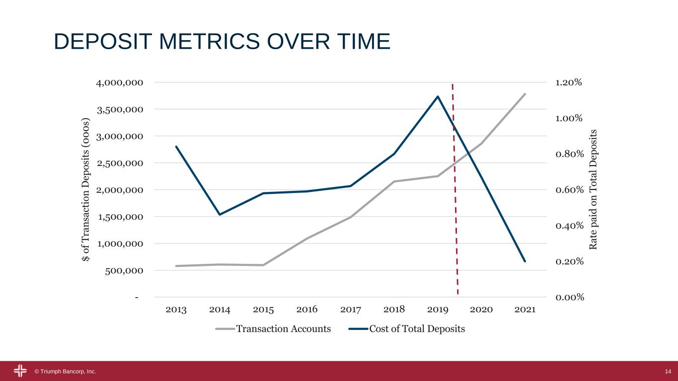© Triumph Bancorp, Inc. PRIMARY DRIVER #3 — TBK Bank improves its efficiency, maintains pristine credit quality, and continues growing fee income and deposits. 13 MAINTAIN OPERATIONAL LEVERAGE MODERATE LOAN GROWTH GROW TRANSACTIONAL DEPOSIT ACCOUNTS CREDIT VIGILANCE