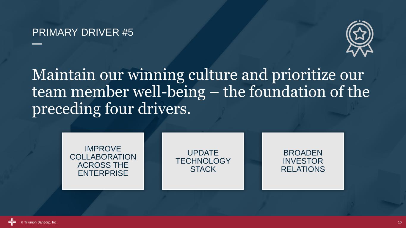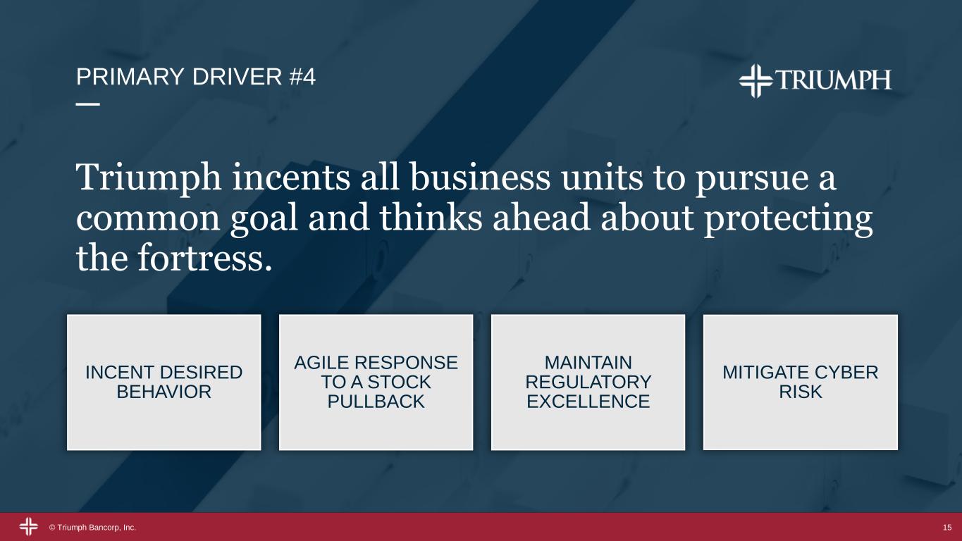 © Triumph Bancorp, Inc. PRIMARY DRIVER #4 — Triumph incents all business units to pursue a common goal and thinks ahead about protecting the fortress. 15 INCENT DESIRED BEHAVIOR AGILE RESPONSE TO A STOCK PULLBACK MAINTAIN REGULATORY EXCELLENCE MITIGATE CYBER RISK