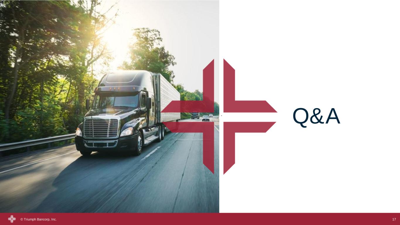 © Triumph Bancorp, Inc. PRIMARY DRIVER #5 — Maintain our winning culture and prioritize our team member well-being – the foundation of the preceding four drivers. 16 IMPROVE COLLABORATION ACROSS THE ENTERPRISE UPDATE TECHNOLOGY STACK BROADEN INVESTOR RELATIONS
