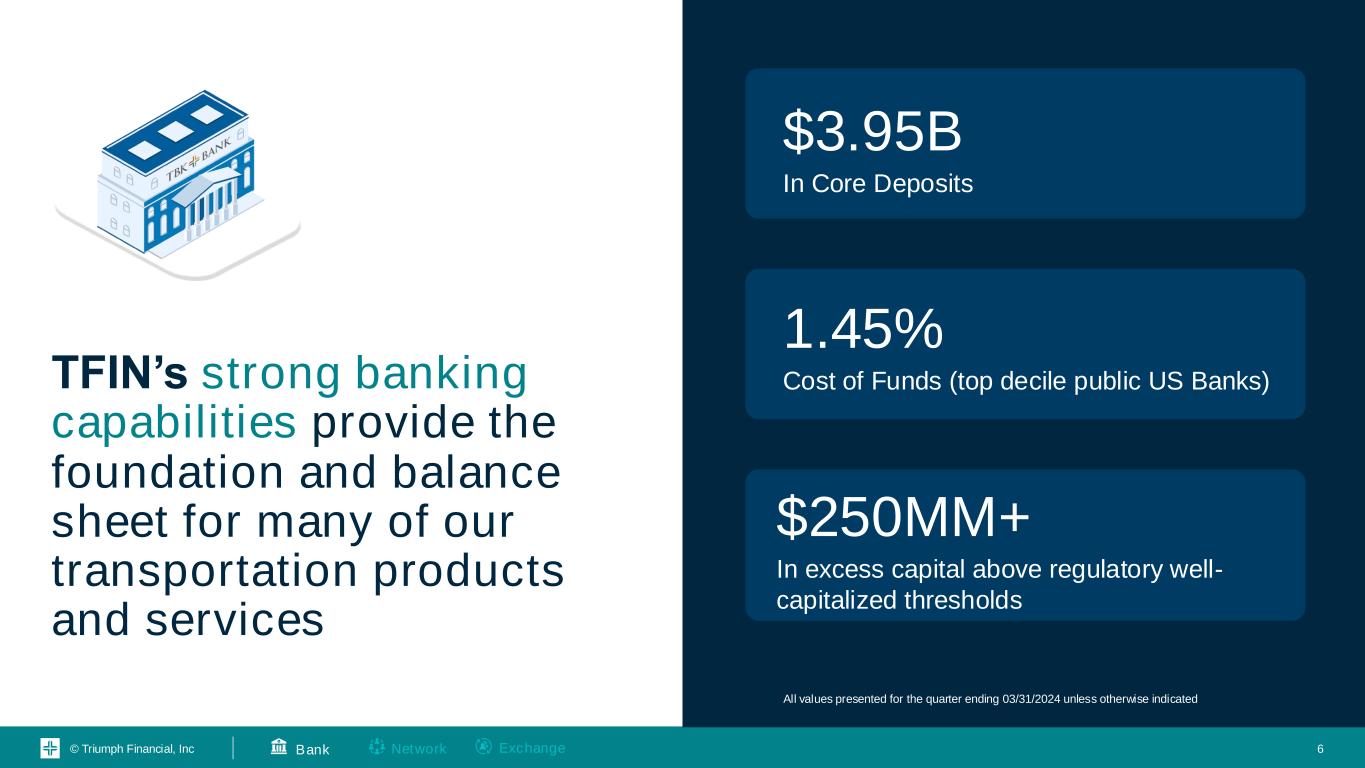 © Triumph Financial, Inc 1.45% Cost of Funds (top decile public US Banks) $250MM+ In excess capital above regulatory well- capitalized thresholds TFIN’s strong banking capabilities provide the foundation and balance sheet for many of our transportation products and services 6Network ExchangeBank $3.95B In Core Deposits All values presented for the quarter ending 03/31/2024 unless otherwise indicated