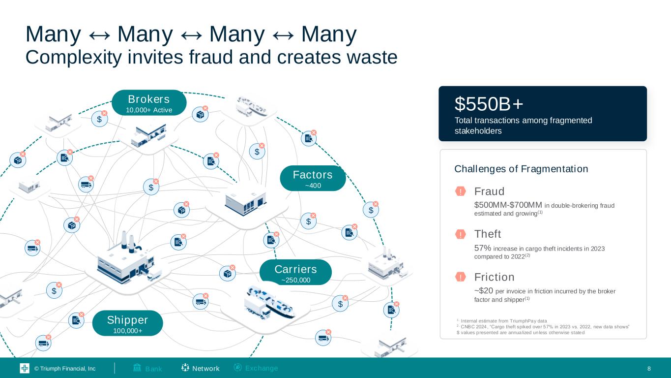 © Triumph Financial, Inc Many Many Many Many Complexity invites fraud and creates waste Fraud $500MM-$700MM in double-brokering fraud estimated and growing(1) Theft 57% increase in cargo theft incidents in 2023 compared to 2022(2) Friction ~$20 per invoice in friction incurred by the broker factor and shipper(1) ! ! ! Challenges of Fragmentation 1. Internal estimate from TriumphPay data 2. CNBC 2024, “Cargo theft spiked over 57% in 2023 vs. 2022, new data shows” $ values presented are annualized un less otherwise stated $550B+ Total transactions among fragmented stakeholders Brokers 10,000+ Active $ $ $ $ $ $ Shipper 100,000+ Factors ~400 Carriers ~250,000 $ Network ExchangeBank 8