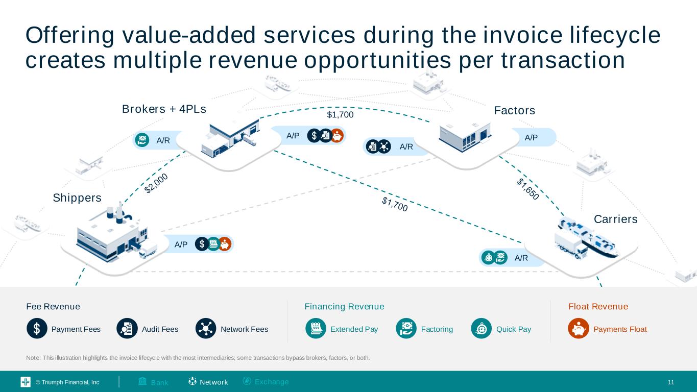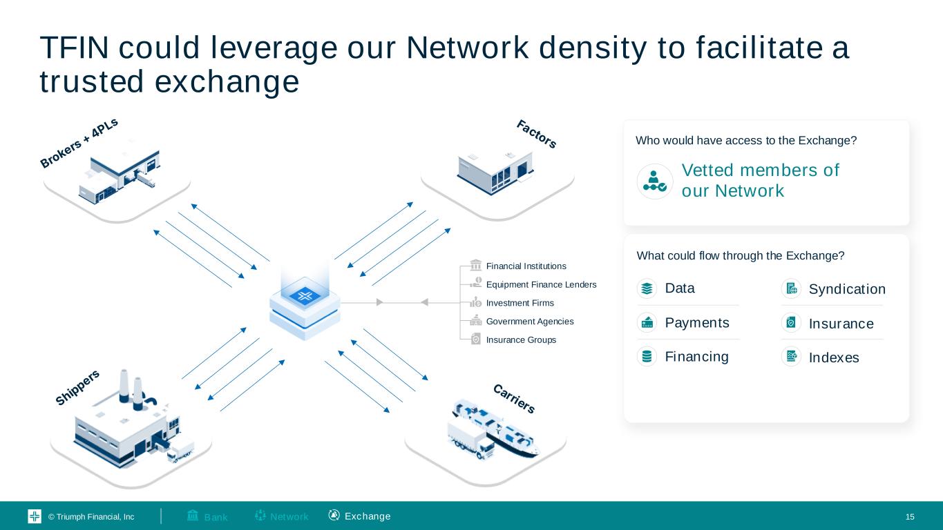 © Triumph Financial, Inc TFIN is creating a trusted network to connect parties, facilitate payments and reduce friction Shipper 100,000+ Factors ~400 Brokers 10,000+ Active Operational efficiency enabled through Triumph Financial's structured data between parties Visibility afforded in our Network strengthens the veracity of documentation and reduces fraud and misdirected payments Access to liquidity to extend DPO and reduce DSO Insights and benchmarking to inform better business decisions Benefits of the Network $ $ $ $ $ $ $ Carriers ~250,000 Network ExchangeBank 9