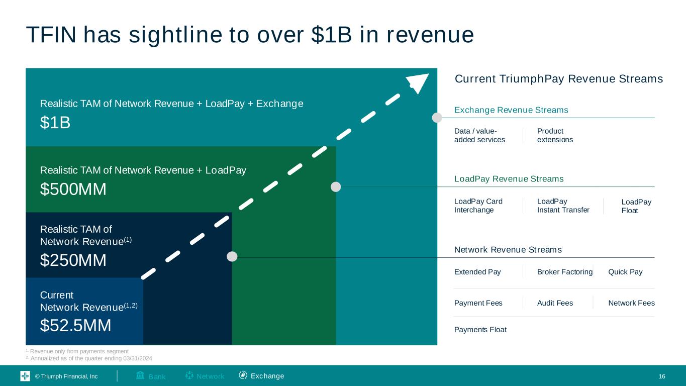 © Triumph Financial, Inc TFIN has sightline to over $1B in revenue 16 Current Network Revenue(1,2) $52.5MM Realistic TAM of Network Revenue(1) $250MM Realistic TAM of Network Revenue + LoadPay $500MM Realistic TAM of Network Revenue + LoadPay + Exchange $1B 1. Revenue only from payments segment 2. Annualized as of the quarter ending 03/31/2024 Current TriumphPay Revenue Streams Network Revenue Streams Extended Pay Broker Factoring Quick Pay Payment Fees Audit Fees Network Fees Payments Float Exchange Revenue Streams Data / value- added services Product extensions LoadPay Revenue Streams LoadPay Card Interchange LoadPay Instant Transfer LoadPay Float Network ExchangeBank