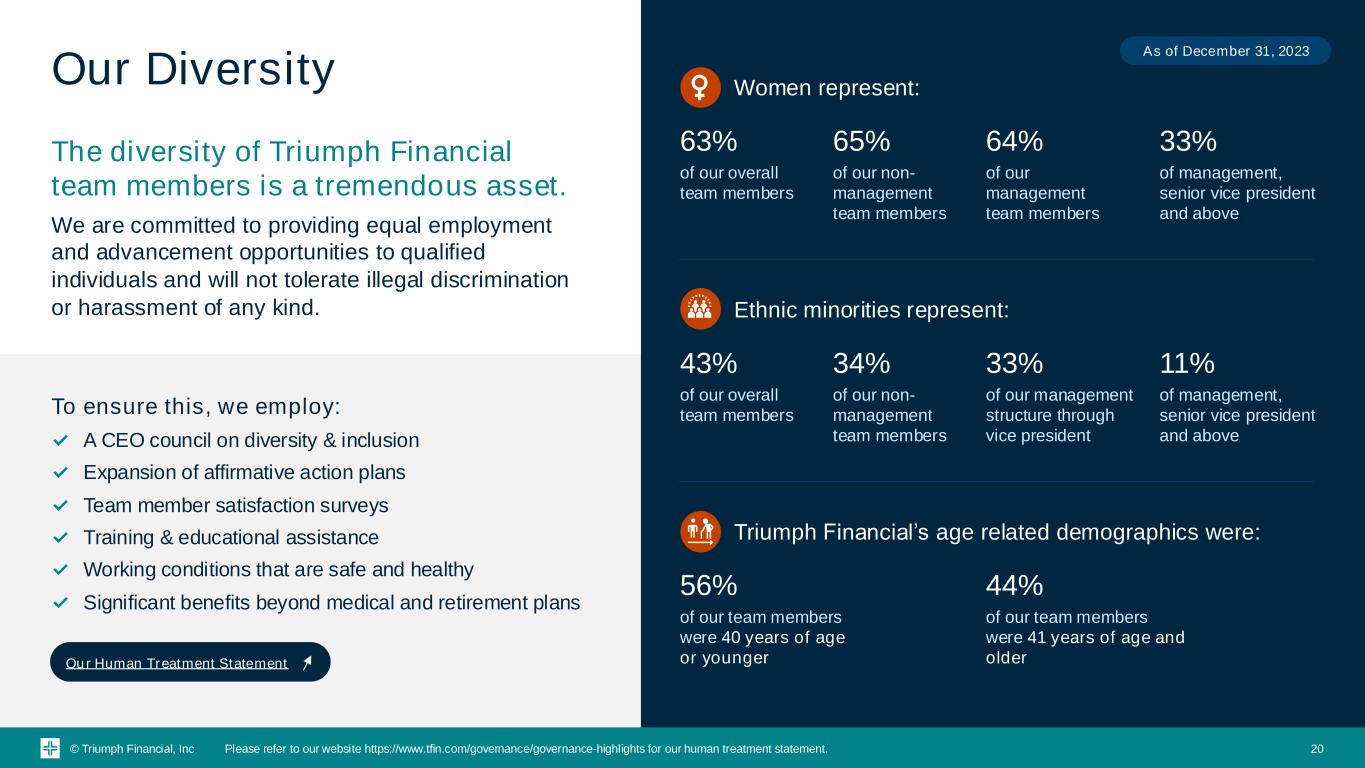 © Triumph Financial, Inc Our Diversity The diversity of Triumph Financial team members is a tremendous asset. We are committed to providing equal employment and advancement opportunities to qualified individuals and will not tolerate illegal discrimination or harassment of any kind. Women represent: 63% of our overall team members 65% of our non- management team members 64% of our management team members 33% of management, senior vice president and above Our Human Treatment Statement To ensure this, we employ: ✓ A CEO council on diversity & inclusion ✓ Expansion of affirmative action plans ✓ Team member satisfaction surveys ✓ Training & educational assistance ✓ Working conditions that are safe and healthy ✓ Significant benefits beyond medical and retirement plans Ethnic minorities represent: 43% of our overall team members 34% of our non- management team members 33% of our management structure through vice president 11% of management, senior vice president and above Triumph Financial’s age related demographics were: 56% of our team members were 40 years of age or younger 44% of our team members were 41 years of age and older As of December 31, 2023 20Please refer to our website https://www.tfin.com/governance/governance-highlights for our human treatment statement.